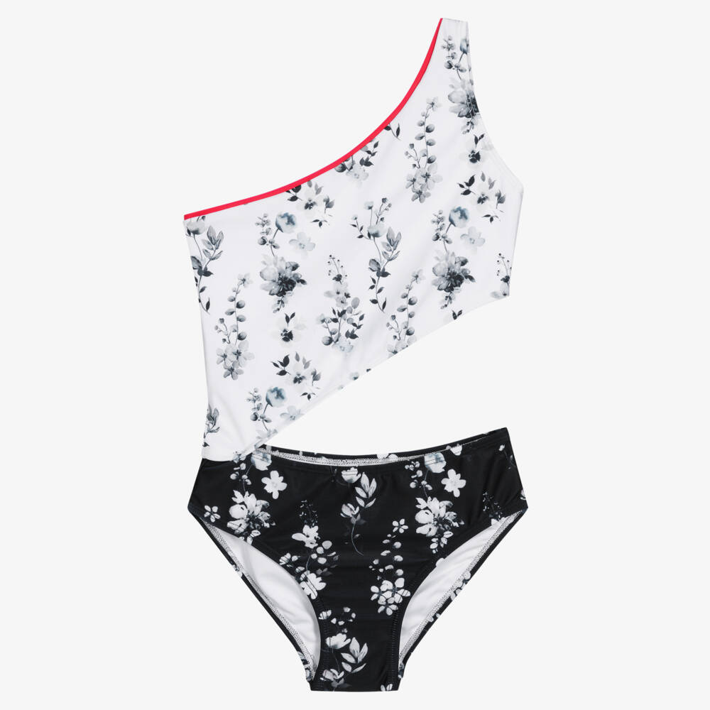 Black and white swimsuit for teen girls by Olga Valentine, designed in a contrasting floral pattern with a gorgeous red trim. A contemporary style, this elegant one-piece features an asymmetrical design with one shoulder strap and a side cut out below the waist. Made with recycled materials, this silky and stretchy swimsuit comes with a UPF 50+ and a full lining for added comfort.