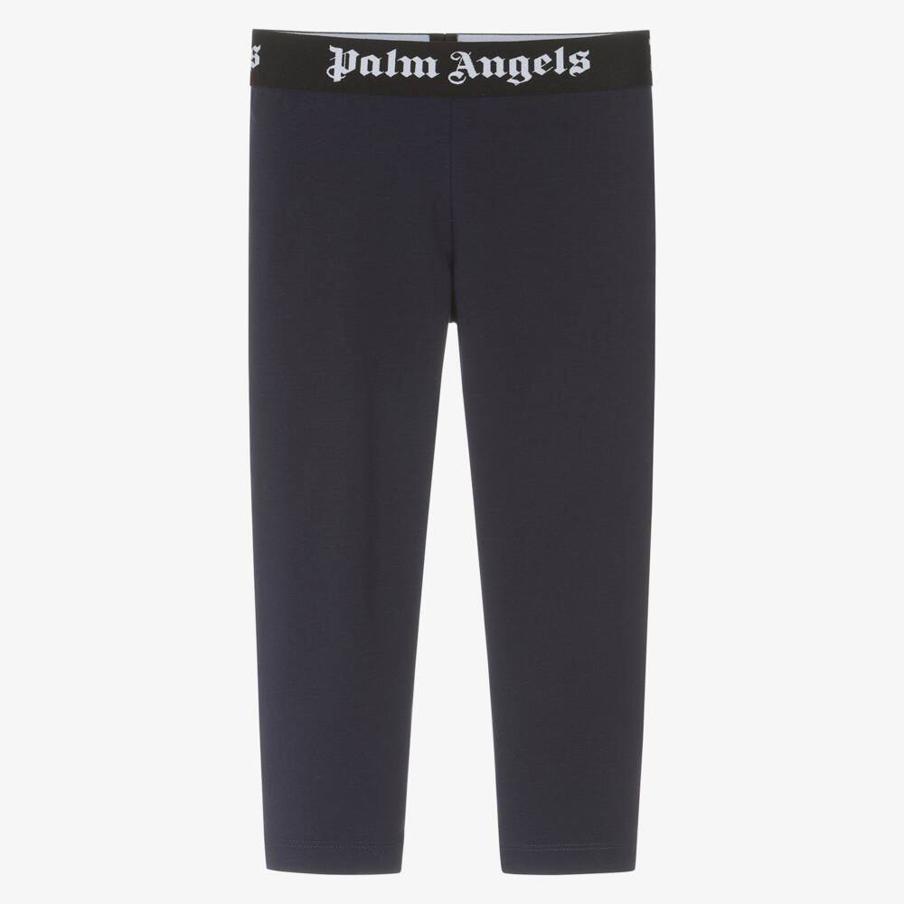Navy blue cotton jersey leggings for girls by Italian fashion house Palm Angels. Full length, they have an elasticated waistband for comfort, with jacquard logo branding for a signature designer look.