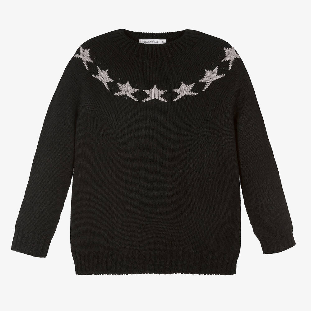 Casual black sweater for boys by Paloma de la O, knitted from soft acrylic with a grey star design around the neckline.