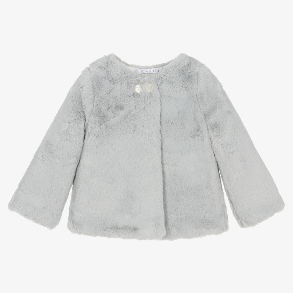Gorgeous grey faux fur jacket for younger girls by Paloma de la O. Beautifully soft and cosy, it is lightly padded and has a comfortable cotton twill lining with fun forest camping-themed prints. A stylish collarless design, it fastens simply with two pearlised buttons at the neck.