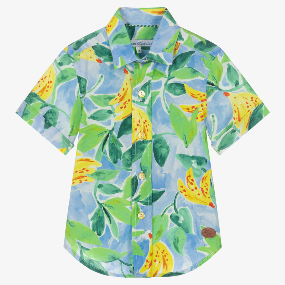Casual blue shirt for boys by Pan Con Chocolate, with a fun yellow and green banana print. Woven in soft lightweight cotton, it fastens with yellow mother-of-pearl buttons that are logo branded for a subtle designer touch.
