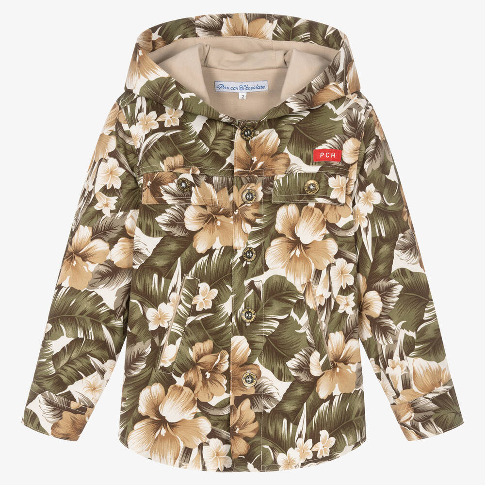 Khaki green and beige shacket for boys by Pan Con Chocolate, with a stylish tropical floral print. It is woven in smooth twill fabric and the hood is lined in soft and comfortable jersey. There are useful pockets on the front, with a small red logo label and branded button fastenings adding a subtle designer finish.