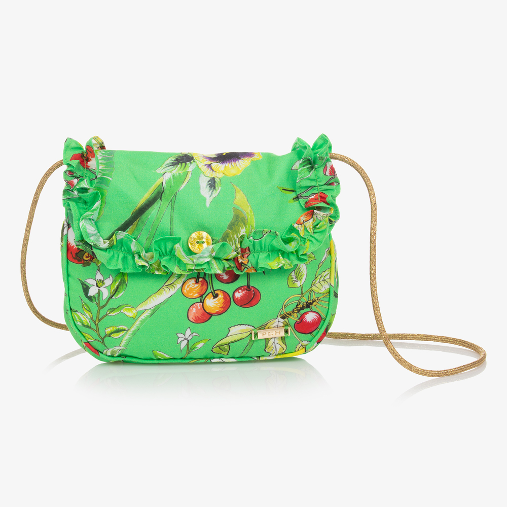 Girls green shoulder bag from Pan Con Chocolate, made with soft cotton poplin printed with a colourful fruit and floral all-over print. There is a lined main compartment that fastens with a single button. It is trimmed with ruffles and a gold metal logo plate. The shoulder strap is made with a metallic gold cord.