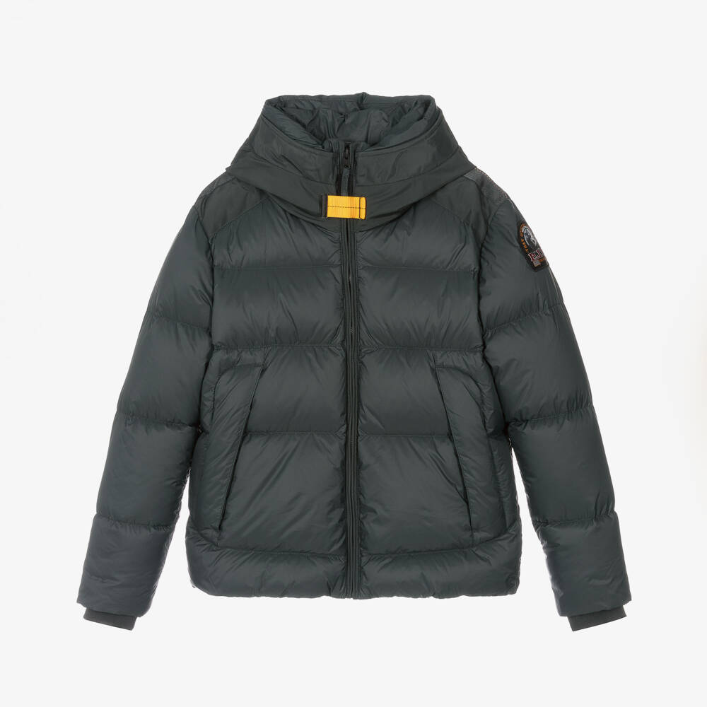 Mini-me dark green jacket for teen boys by Italian label Parajumpers, complete with iconic details such as the yellow velcro tape below the chin and a distinctive logo patch on the arm. A design seen in the adult collection, this sleek zip-up puffer is made in silky smooth Cordura ripstop with nylon oxford inserts and a water repellent coating. Both windproof and waterproof, it has a spacious hood, inner ribbed cuffs and a lightweight, breathable down filling. The hem is lightly elasticated to ensure a comfortable fit. Two functional zip pockets are concealed on the front, along with an inner mesh pocket for extra storage. This garment is made with 25% recycled fabric.