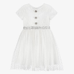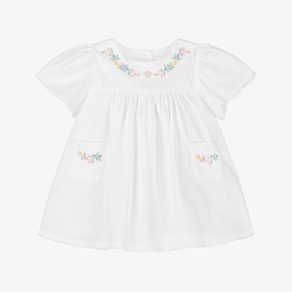 A beautiful white cotton Patachou dress for baby girls. Adding a timeless touch, it has lovely floral embroidery in subtle hues and delicate scalloped trims. Lightweight with a fine striped weave and voile lining, this delightful dress buttons up on the back and has cute short sleeves.
