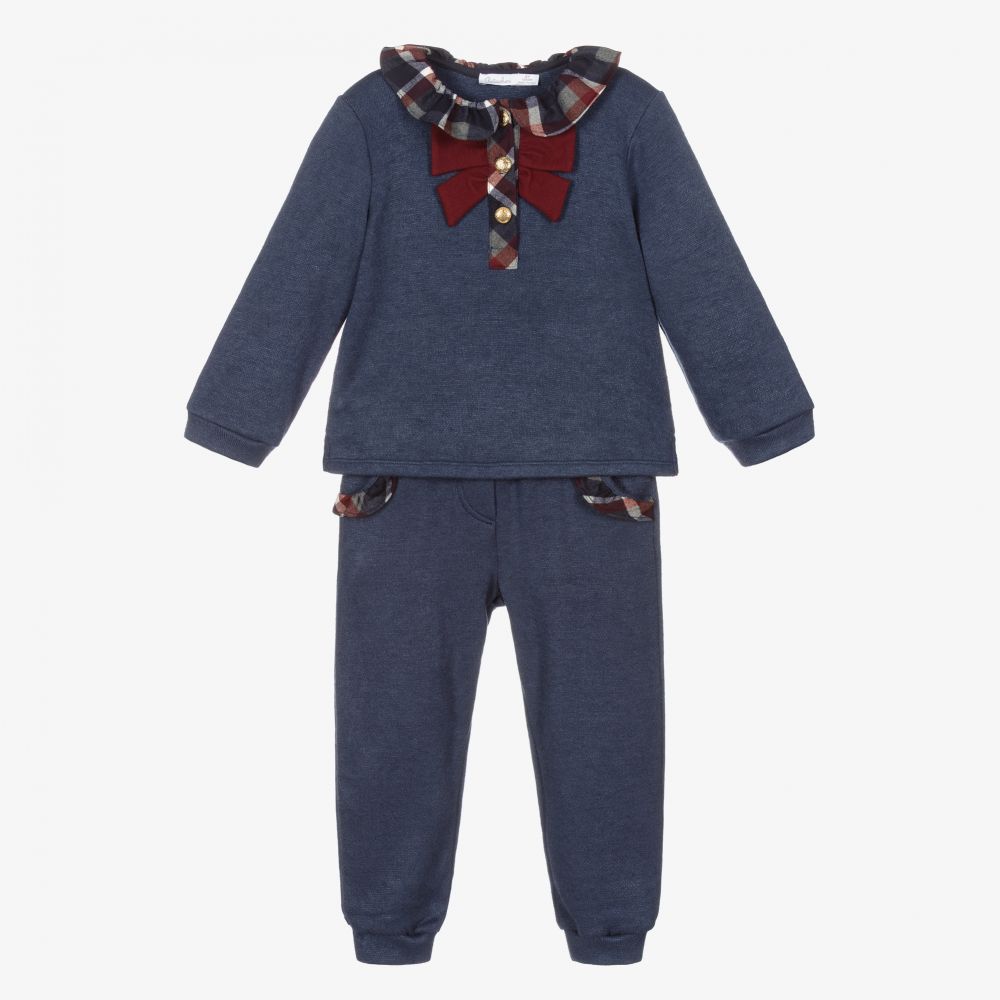 Girls navy blue top and trouser set from Patachou, exclusive to Childrensalon. Knitted in a soft and stretchy viscose blend, both pieces have burgundy red, navy blue and white checked trims. The top has a sweet ruffled collar, gold crest buttons and a red bow trim. The joggers have front pockets and elasticated waistband and cuffs.