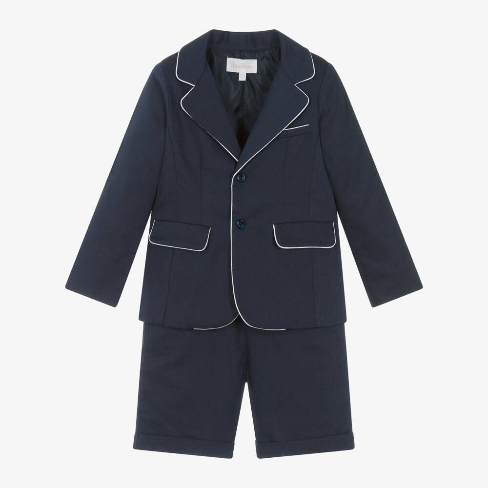 Smart navy blue shorts suit for boys by Patachou, with elegant European style. Made in a lightweight linen and cotton blend, the blazer has white piping trim, logo button fastenings and a satin lining. Styled with a single vent at the back, it has two front flap pockets and a faux chest pocket. The coordinating, lined shorts fasten with a button and concealed zip, with an adjustable waist for a tailored fit. Fixed turn-ups add a stylish touch and they have slanted front pockets with a single welt pocket on the back.
