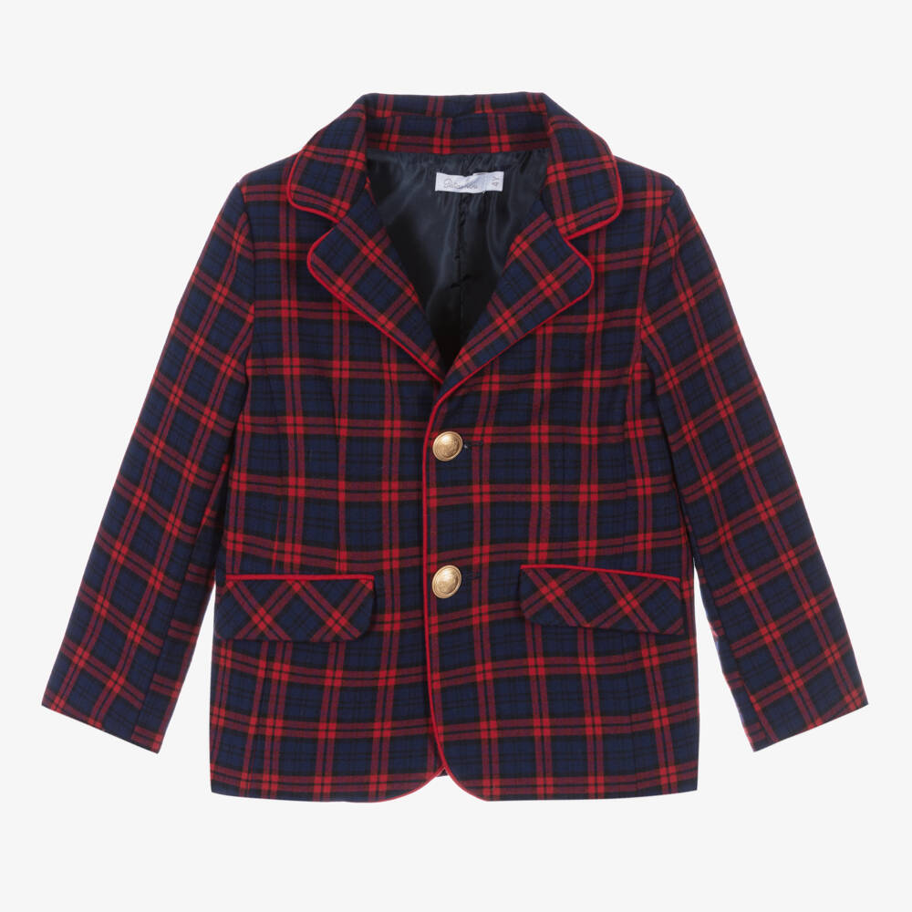 Exclusive to Childrensalon, this blue and red tartan blazer for boys is by Portuguese brand Patachou. Made in a soft viscose blend, this classic style has gold button fastenings and flap pockets on the front. It is lined with silky smooth fabric for added comfort.