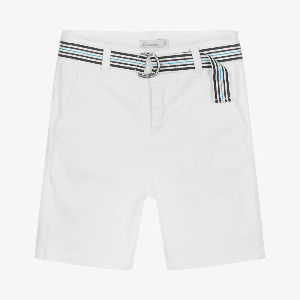 Classic white Bermuda shorts for boys by Patachou, with a removable striped belt in navy blue and white. Soft and comfortable, they are made in stretchy cotton twill. They have an adjustable waist for an ideal fit, a button and zip fastening, and three useful pockets. For a subtle designer touch, there is an embroidered tonal logo on the back.