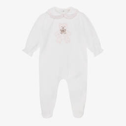 A charming white babygrow for boys by Patachou, made from super soft cotton velour. It has red tartan trims on the pointed collar, faux front pockets, and buttoned cuffs. Fastening with poppers on the back and between the legs, it has a little logo charm on one side and branded button details on the chest.