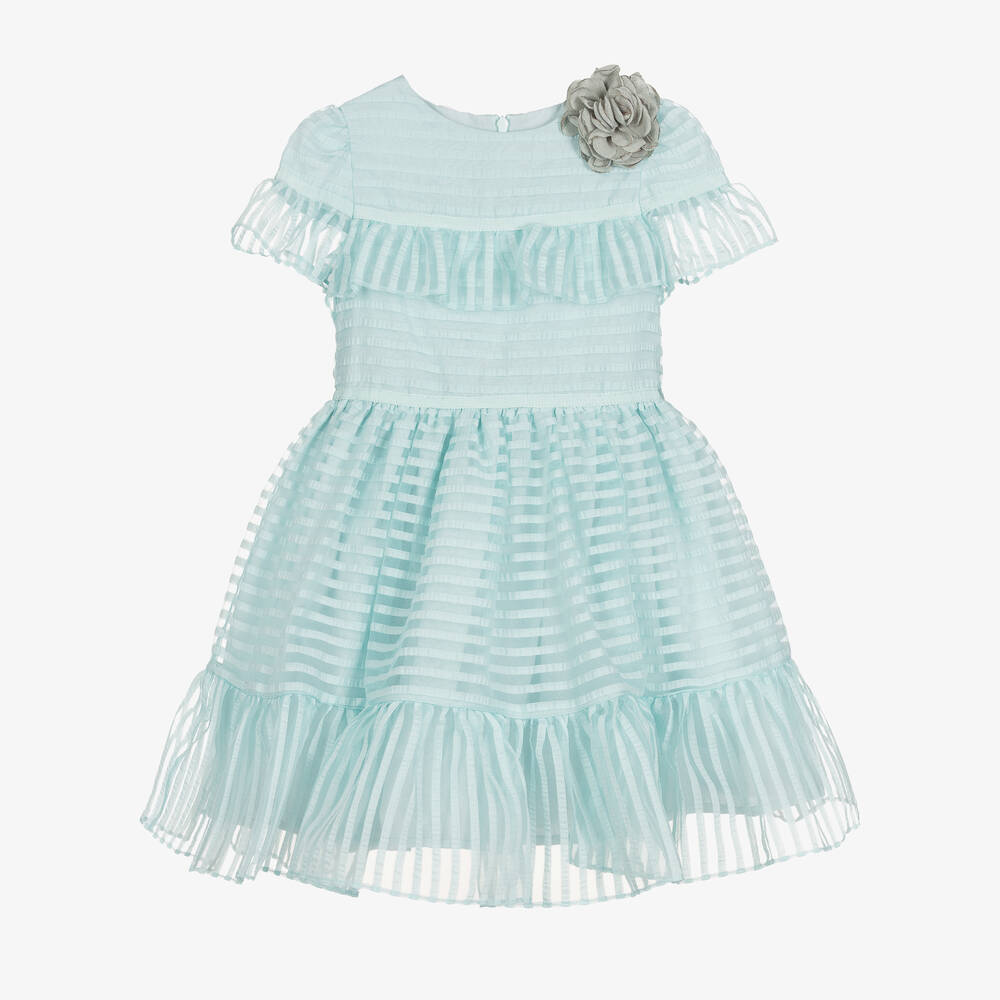 Exclusive to Childrensalon, a special occasion dress for girls by Patachou, in a lovely aqua green shade. Made in striped organza with feminine ruffles on the bodice and hem, it has capped sleeves and a grosgrain ribbon on the waistline. A tonal green floral appliqué adds a lovely finish and the dress has a lightweight cotton lining and a concealed zip fastening on the back.