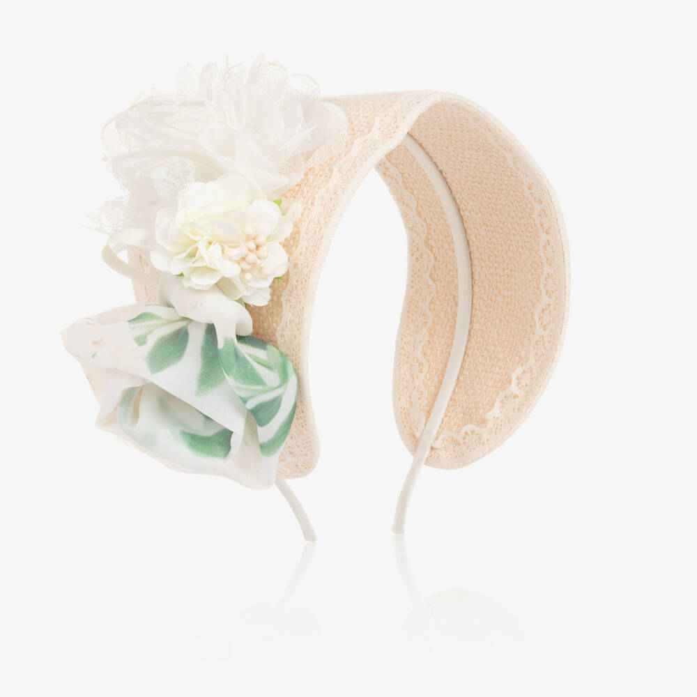 Elegant and charming, this beige and white hairband for girls is by Patachou. For a sweet look, it has a wide woven straw-effect panel, embellished with fabric flowers and a pretty lace trim for added femininity. The narrow flexible band is covered in smooth satin for comfortable wear.
