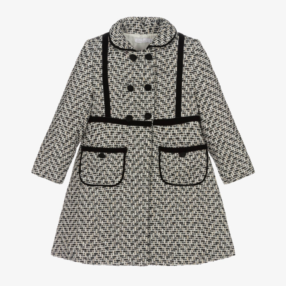 A beautifully elegant coat for girls by Patachou, in a classic black and ivory tweed. It has smart black velvet trims and a double breasted button fastening on the front for a traditional style. Lined in silky satin for luxurious comfort, it has patch pockets on the front.