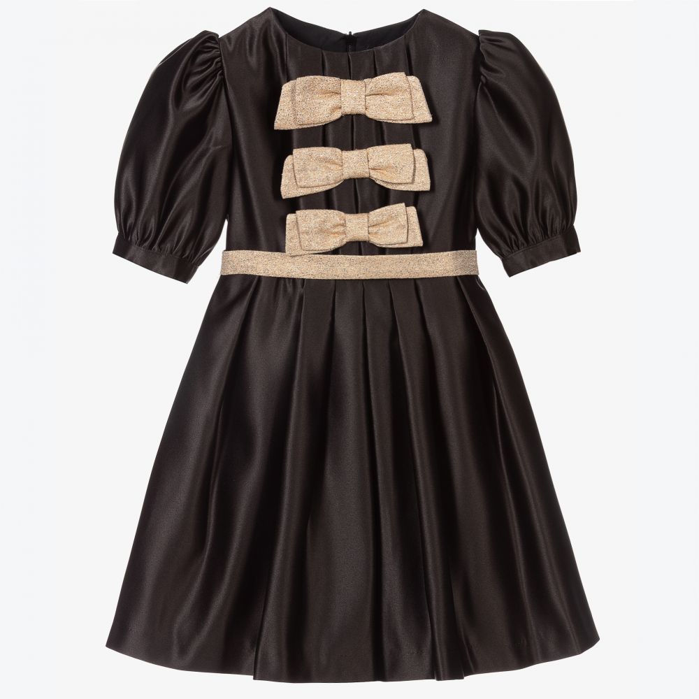 Black dress for girls by Patachou, exclusive to Childrensalon. Made with black silky satin, this puffed-sleeved dress has a layer of tulle under the skirt and sparkly gold bows on the bodice. It has a fixed gold belt that fastens with buttons on the back. There is a back zip fastening and a cotton lining for comfort.