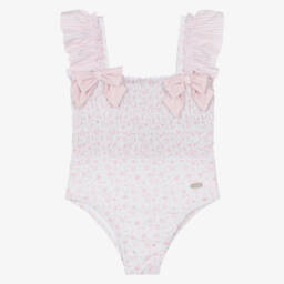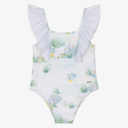 Lovely blue and white striped swimsuit for girls by Patachou, detailed with pretty red ruffles with cut-out flowers. Lightweight and fully lined, it has slim red straps and a low-cut back. A shiny silver logo charm on the front completes this cute swim style with a touch of sparkle. This item is made with silky smooth and stretchy fabric with UV50.