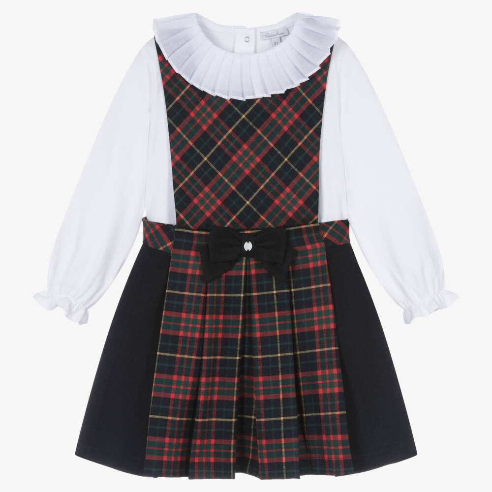 Navy blue and red tartan pinafore dress and white top set for girls by Patachou. The top is made in soft, mid-weight jersey with a warm brushed feel. It has a pretty pleated collar and fastens with poppers on the back. The pinafore dress is made in soft, cosy flannel and has a pleated skirt and a navy blue bow trim on the front with a logo charm. It is lined for comfort and has a concealed zip fastening on the back.