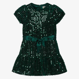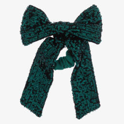 Exclusive to Childrensalon, an eye-catching green hair scrunchy by Patachou, ideal for adding a touch of glamour to any outfit. It features a large, attached bow embellished with shimmering sequins that catch the light beautifully. The elasticated band is fabric-covered for a comfortable fit.