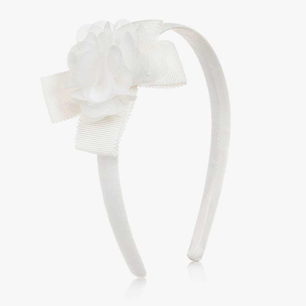 An ivory hairband for girls from Patachou. Lovely for that special occasion or smart day out, this lovely hairband is topped with a tonal grosgrain bow and delicate chiffon flower. The satin-covered band is flexible for comfortable wear.