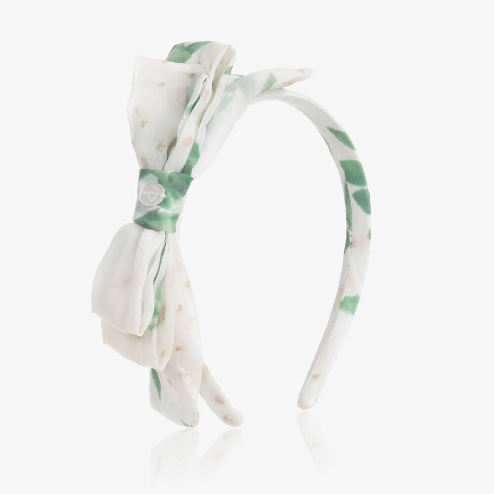 An ivory chiffon hairband for girls by Patachou, signed with a pearlescent logo charm. Patterned with a beautiful flower pattern, it has an elegant bow stitched to one side for a pretty effect. The fabric-covered band is flexible to ensure comfortable wear.