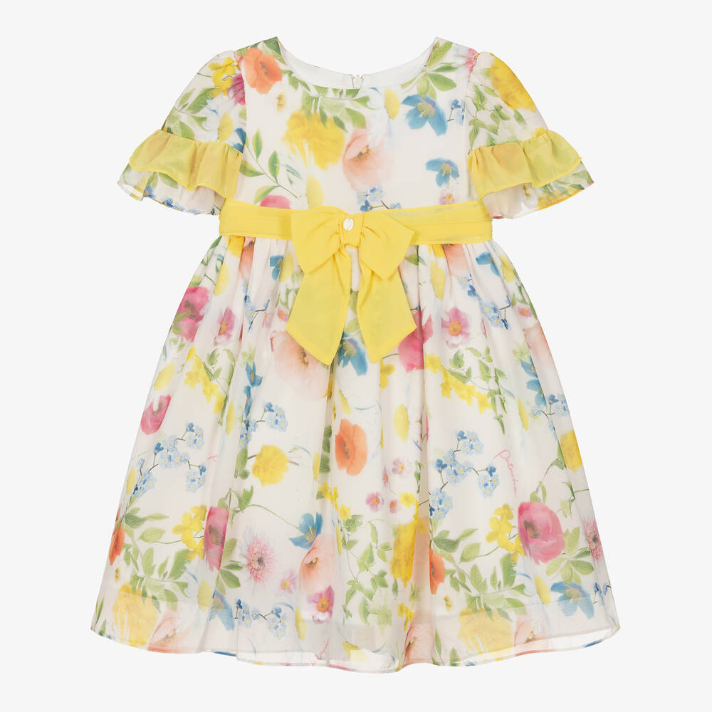 So pretty for little girls, an ivory dress from Patachou with a lovely floral pattern in shades of yellow, pink and blue. This special occasion style, exclusive to Childrensalon, is made in sheer chiffon with delicate ruffle trims. A classic look with a full gathered skirt, it has a yellow crêpe chiffon waistband, with a bow and logo charm at the front. The dress is comfortably lined in lightweight cotton and fastens with a concealed zip on the back.
