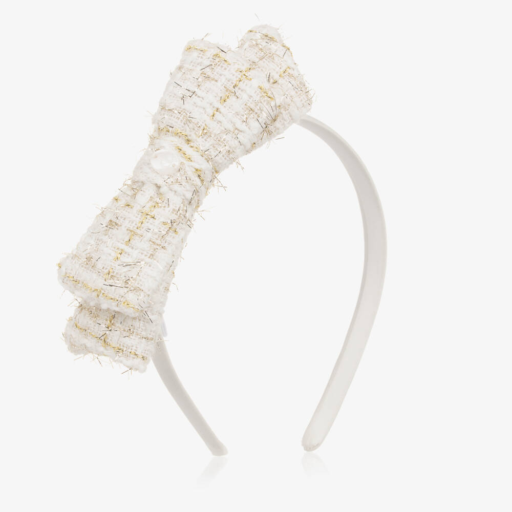 Stylish ivory tweed bow hairband for girls by Portuguese brand Patachou, woven with shiny gold thread for a touch of sparkle. The double bow decoration is trimmed with a logo charm at the centre and sits on a narrow, flexible band.