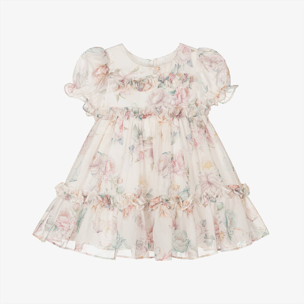 Lovely ivory chiffon dress for girls by classic brand Patachou, with a pink and green floral pattern. With pretty puffed sleeves and ruffles, it fastens on the back with a concealed zip and is lined in comfortable voile.