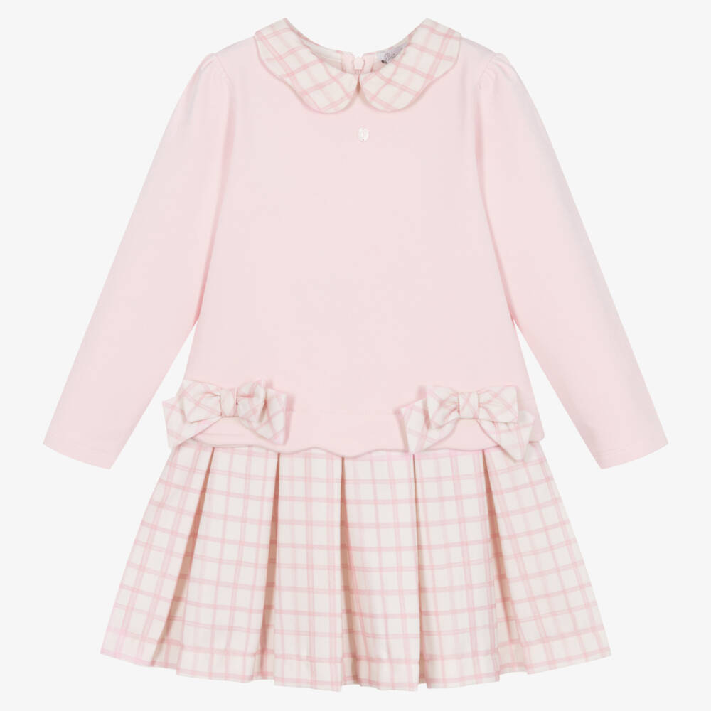 A pretty pale pink long-sleeved dress for girls by Patachou, exclusive to Childrensalon. Made from soft cotton jersey with a fleecy inside, the sweatshirt style bodice has a subtle zigzagged hem that overlays the pink and ivory check pleated skirt. There is a matching collar and bows on the waistline and a concealed zip fastening on the back for a neat finish.