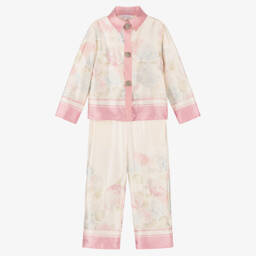 Брючный комплект розовый из хлопкового трикотажа и твида для девочек