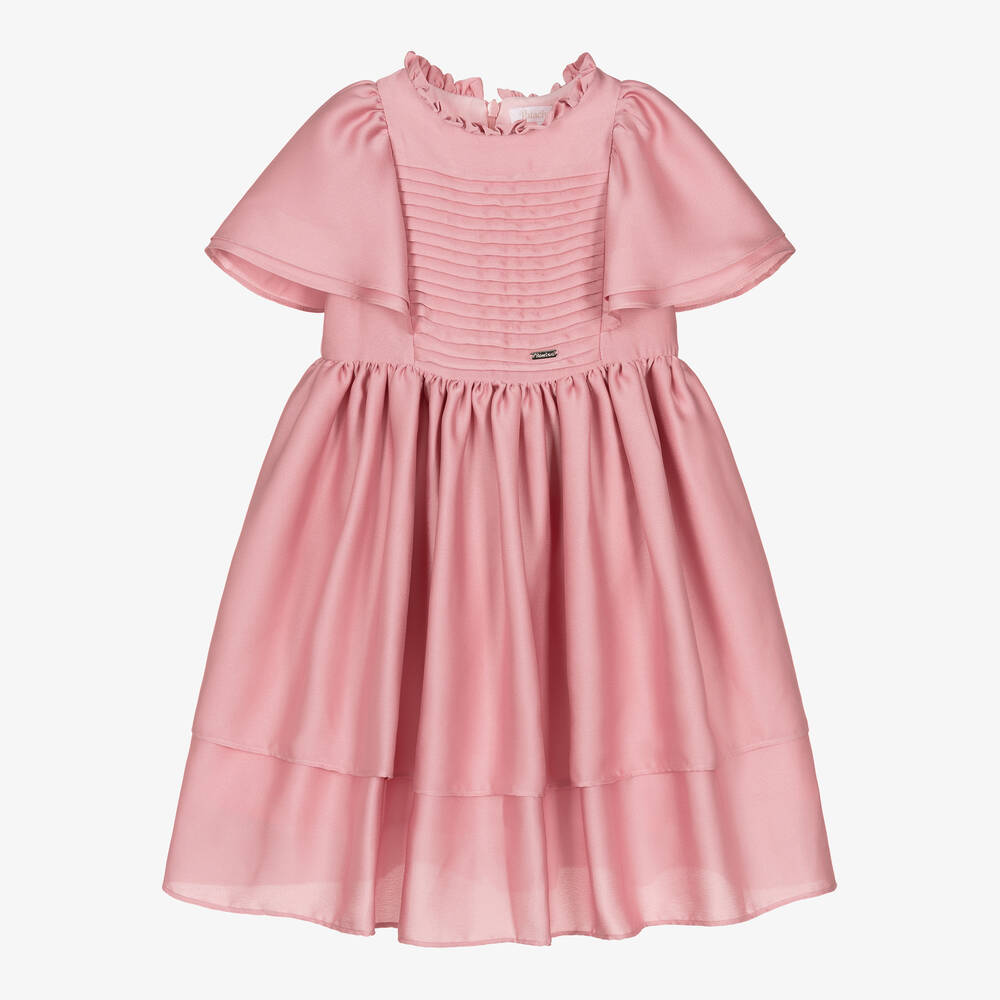 A dusky rose pink dress for girls by Patachou, made in soft crêpe. Beautiful and elegant, it has dainty angel sleeves, ruffles on the neckline, and pleating on the bodice. Gathered on the waist, the skirt is tiered and layered for a lovely effect. This comfortable dress has a soft cotton lining and a discreet back zip fastening.