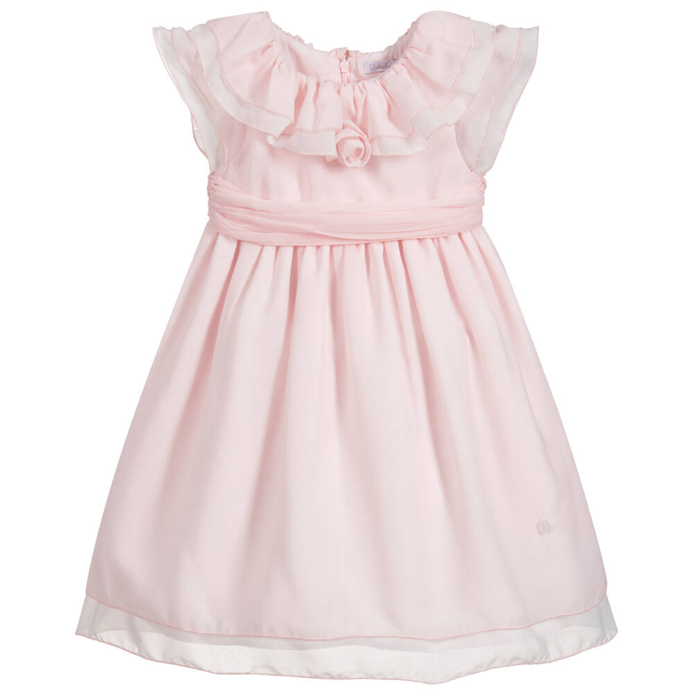 Ideal for a girl's special occasion, a beautiful pale pink chiffon dress with a lightweight cotton and tulle lining by Patachou. It has pretty ruffle trims across the collar, with a fixed sash that ties at the back.
