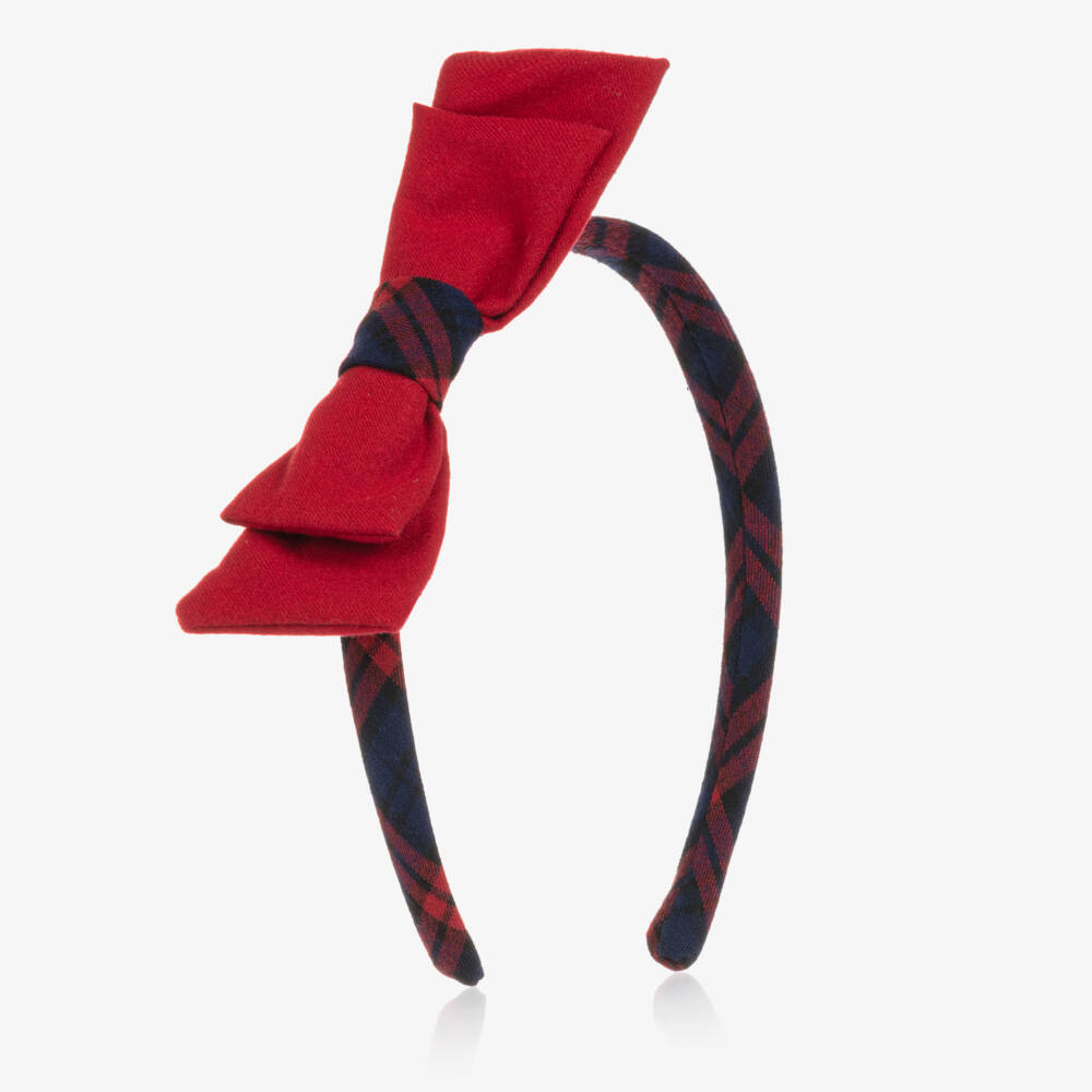 Exclusive to Childrensalon, navy blue and red tartan hairband for girls by Portuguese brand Patachou. The fabric-covered band is flexible for a comfortable, secure fit and a large red bow on the top gives a fun finish.
