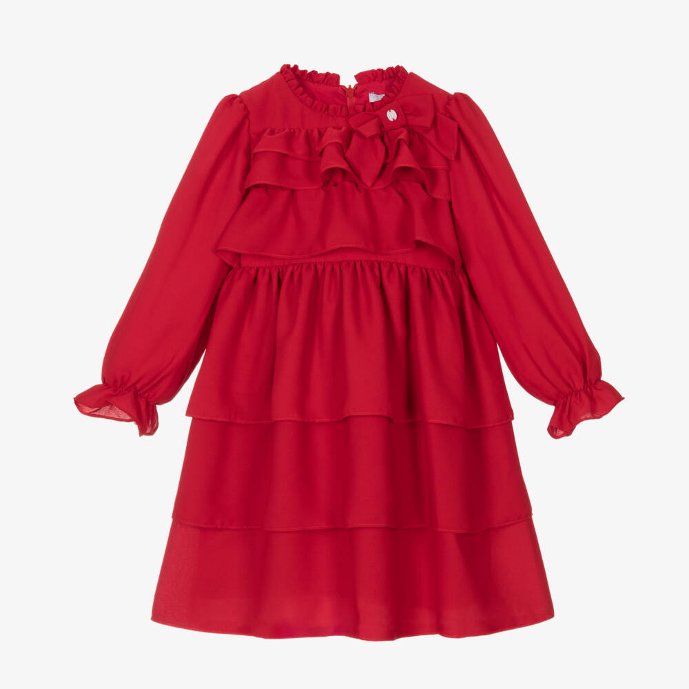 A lovely red dress for younger girls by Patachou, made from soft, floaty chiffon. Fastening with a zip on the back, this classically styled dress has ruffled trims with a matching bow and a subtle logo charm. The long sheer sleeves gently gather on the shoulder and narrow at the cuffs with elasticated trims. The layered skirt is lined with lightweight cotton voile for added comfort.