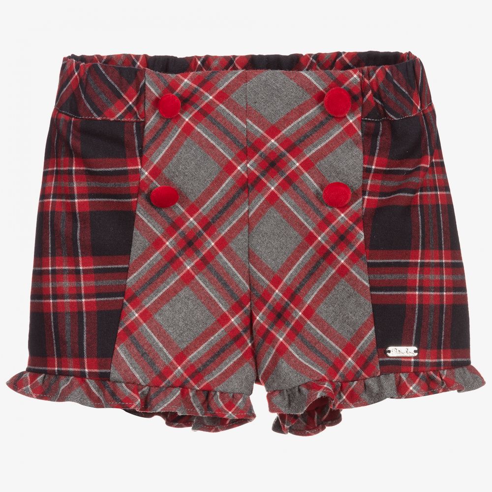 Red, grey and navy blue tartan shorts for girls by Patachou. Made in a soft blend of brushed polyester and viscose, they have red velvet button trims and pretty frilled cuffs. Fully lined, the brand's silver metal logo tab is on one side.