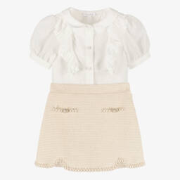 Элегантный комплект из черной бархатной юбки для девочек от Patachou, идеальный выбор для особых случаев. Эксклюзивно для Childrensalon, кремовый топ выполнен из тюля с пайетками, которые блестят на свету, с большим, привлекающим внимание черным бархатным бантом спереди и скрытыми застежками-кнопками. Он прекрасно сочетается с мягкой черной бархатной юбкой, которая имеет элегантный подол с коробчатыми складками и регулируемый пояс для комфортной посадки.