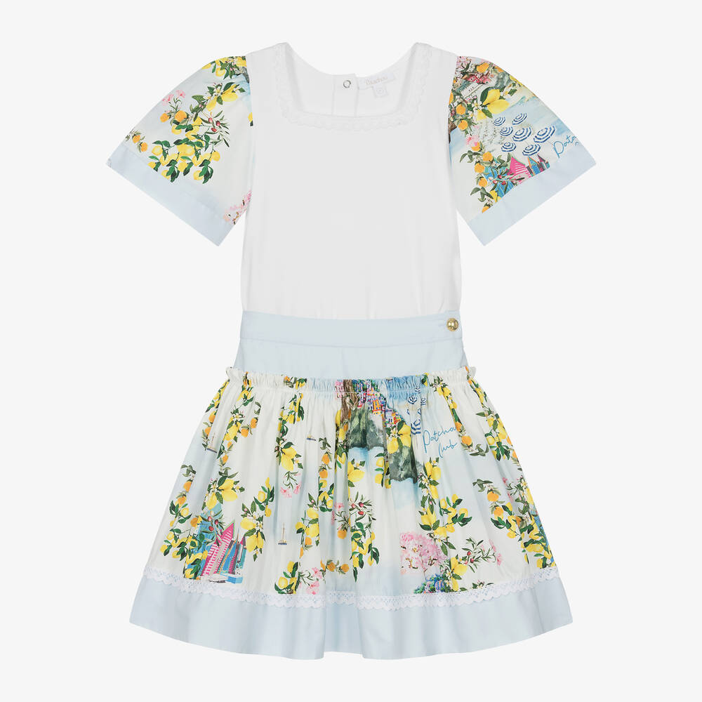 A white and blue cotton skirt set for girls by Patachou, with a stunning Mediterranean-themed design. Trimmed with delicate lace, the fully lined skirt has a beach club logo pattern, detailed with oranges, lemons and pink blossoms. There are gathers below the waist creating a full shape, with a gold-tone button and zip fastening on the side and an adjustable waistband to ensure a good fit. The white jersey tee has a matching print on the puffed sleeves and a lace-trimmed square neckline. It fastens easily on the back with poppers.