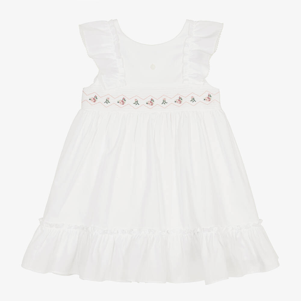 A charming white dress for girls by Patachou, woven in beautifully lightweight, finely ribbed cotton. Lovely for warmer days, it is detailed on the bodice with delicate pink and green floral embroidery, with a logo charm adding a discreet designer detail. For feminine styling, it has pretty ruffles over the shoulders, a frilled hem and a V-shape back. Comfortably lined in lightweight voile, the dress fastens neatly on the back with buttons, with a decorative bow adding a pretty finish.