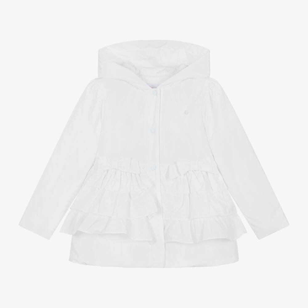 A hooded white coat for girls from Patachou, designed with pretty frills and bows for a feminine look. Smooth and silky on the outside, it is lightly padded for warmth and has a comfortable cotton jersey lining. It fastens easily with practical poppers on the front and has a little logo disc on the chest for a subtle branded finishing touch.
