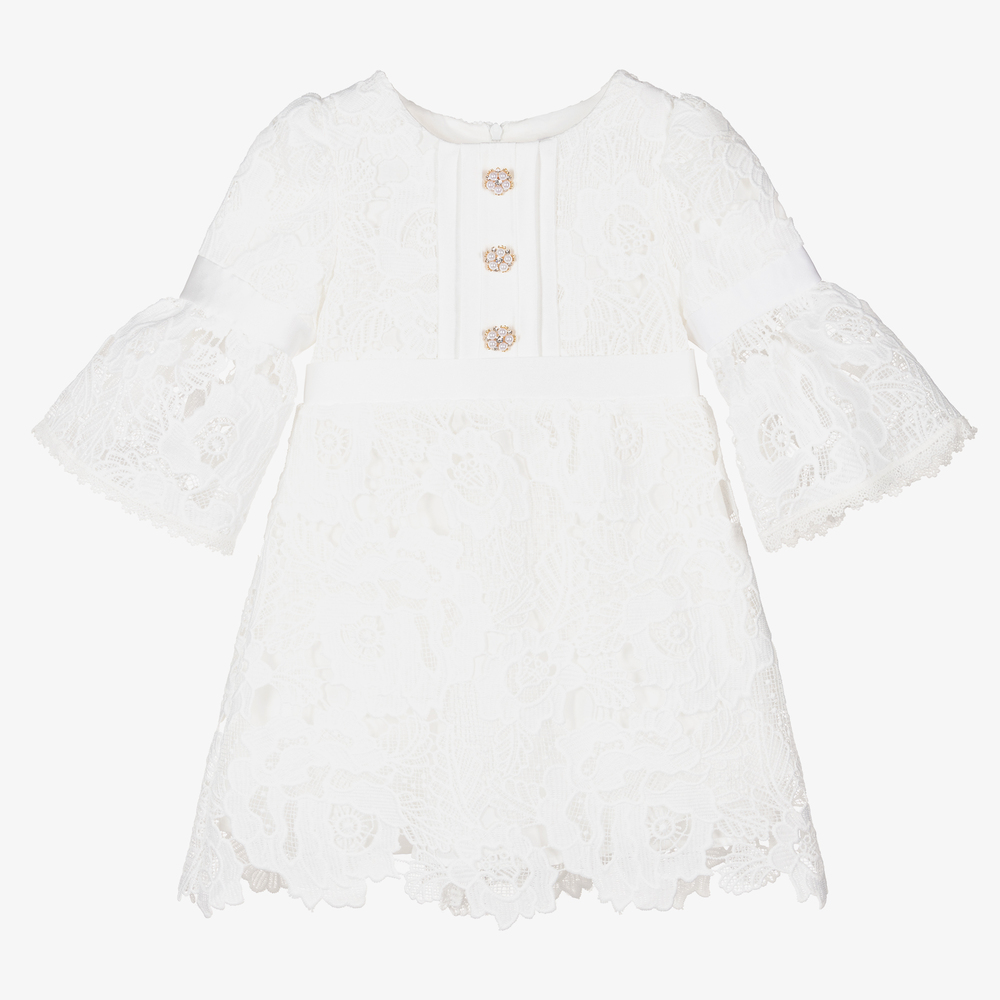 White special occasion dress for girls by Patachou, made in beautiful lace with satin trims on the bodice, waistband and bell sleeves. There are decorative buttons on the front sparkling with diamantés, golden metal and pearl beads.