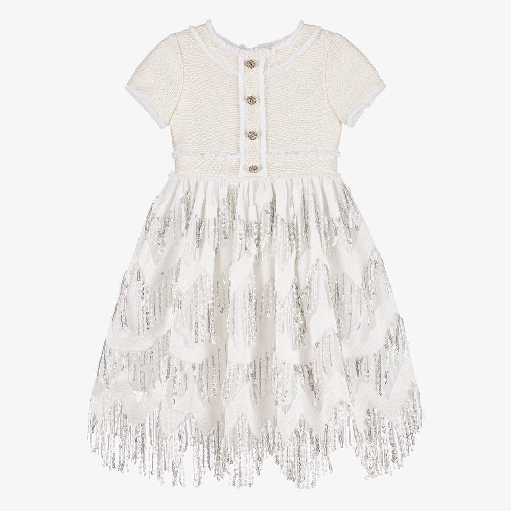 Exclusive to Childrensalon, this lovely white dress for girls is by Patachou. The short-sleeved bodice is made in textured tweed with metallic silver thread throughout. It has sparkly, decorative buttons and fringing detail around the neck and waistline. The embroidered tulle skirt, lined with cotton, is decorated with dangling silver sequins for beautiful movement.