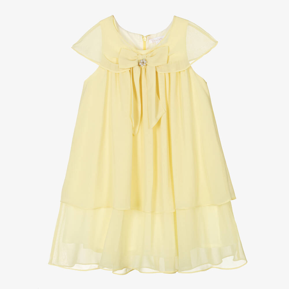 Exclusive to Childrensalon, this yellow dress for girls by Patachou is made from soft chiffon. Romantic and floaty, this short-sleeved dress has a wide sheer collar that sweetly covers the shoulders. There is a pretty bow detail on the front with a faux pearl and crystal embellishment for added sparkle. Lined in lightweight cotton, it has a lovely layered hem and fastens with a concealed zip on the back.