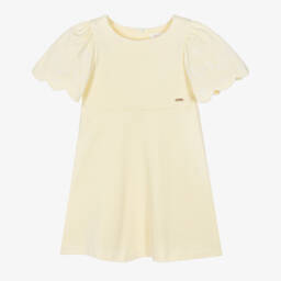 Очаровательное желтое платье А-силуэта для девочек от Patachou с красивыми пышными рукавами, украшенными нежной белой цветочной вышивкой и изящными волнистыми краями. Изготовлено из мягкого и комфортного трикотажа, с розово-золотистой металлической нашивкой с логотипом на лифе.
