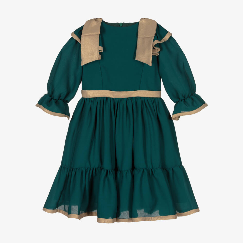 Deep teal green dress for girls by Patachou. Made in a double layer of soft, lightweight cotton, there is a delicate chiffon overlay with glittering gold bows on the shoulders and matching trims on the waist, cuffs and hem. It has three-quarter length sleeves and a concealed zip fastening on the back.