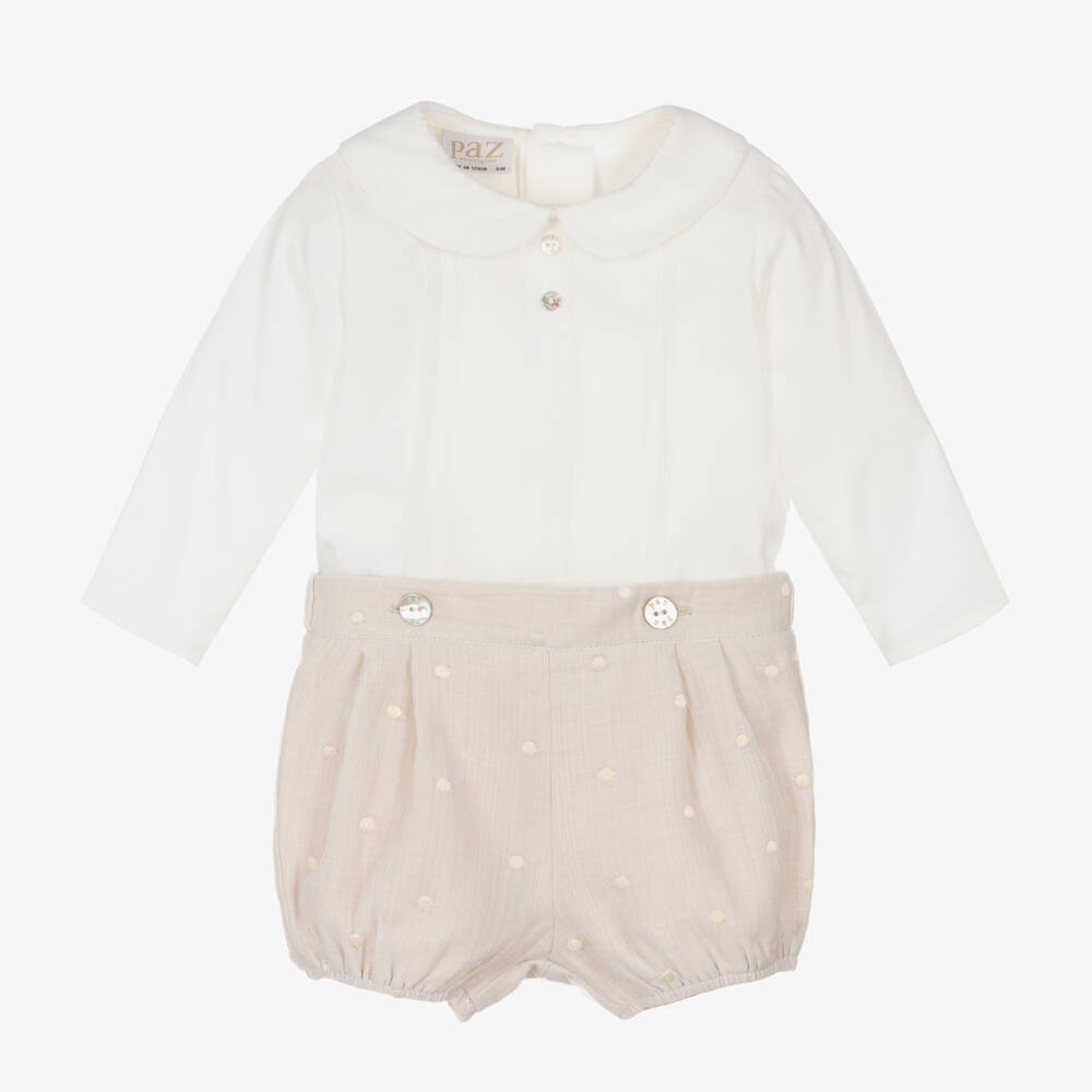 Ivory and beige shorts set for baby boys by Paz Rodriguez, in the softest cotton weave. The shirt has a Peter Pan collar, pin tucks and decorative pearlescent buttons on the chest for a classical look. It fastens with buttons on the back. For a neatly tucked-in look, the shirt fastens onto the embroidered polka dot shorts. The shorts are comfortably finished with an adjustable waistband.
