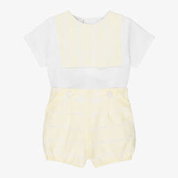 Baby boys white and green dungaree shorts set by Paz Rodríguez, made from soft cotton. With a lightly textured pattern, the dungaree shorts fasten with branded mother-of-pearl buttons. A white jersey bodyvest with a Peter Pan collar and popper fastenings, completes the classic look.