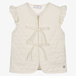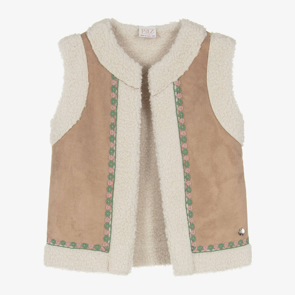 Beige faux suede gilet for girls by classic Spanish brand Paz Rodríguez, with faux fleece edging and pretty pink and green embroidered trims. It has a silver metal logo charm sewn on one side and a cosy, faux fleece lining.