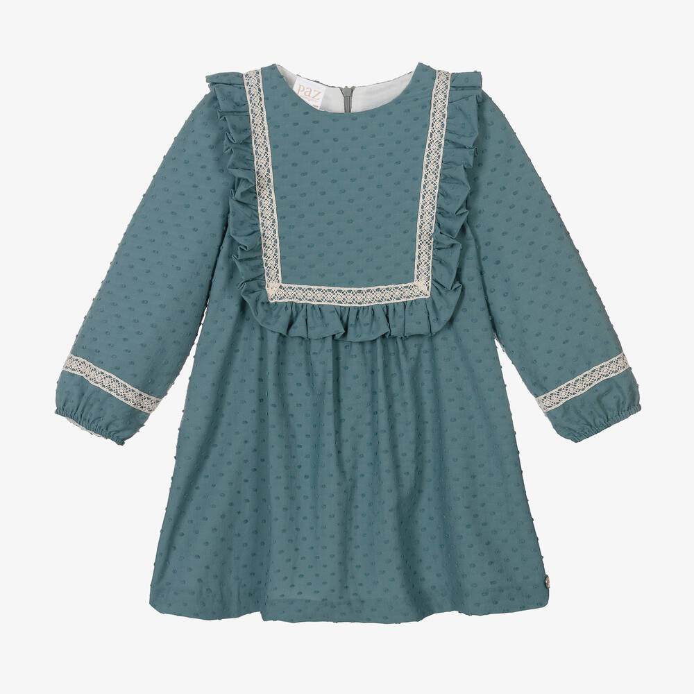 Soft teal green dress for girls by Spanish designer Paz Rodriguez, made in lightweight cotton-blend plumeti. This classic style has a pretty ruffle-edged bib and delicate ivory lace trim. Lined in lightweight cotton for comfort, it has a neat concealed zip fastening on the back and gently elasticated cuffs. There is a branded metal charm on the front hem for a discreet designer finish.