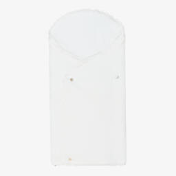 Ideal for keeping baby warm and snug, this ivory nest for baby boys and girls by PAZ Rodríguez, is softly knitted with a delicate pattern. It is lined in cosy velour and lightly padded for comfort, with a sweet scalloped trim around the edge. It fastens along the base with a zip and secures with mother-of-pearl logo buttons on the front. There are useful openings on the back for use in a car seat or stroller.