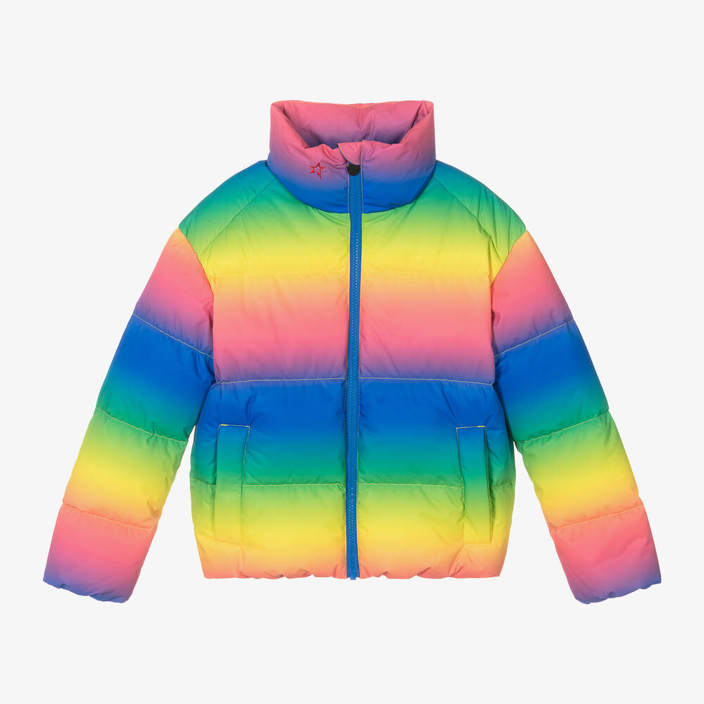 In a bold gradient rainbow pattern, this technical zip-up ski jacket for girls is by Perfect Moment. Super smooth with a lightweight lining, it is down-padded and windproof for additional warmth and has a high neck embroidered with the signature red star logo. Complete with a popper-fastened powder skirt to keep the snow out, the slanted pockets on the front and internal pocket all fasten with zips to help keep ski essentials safe.