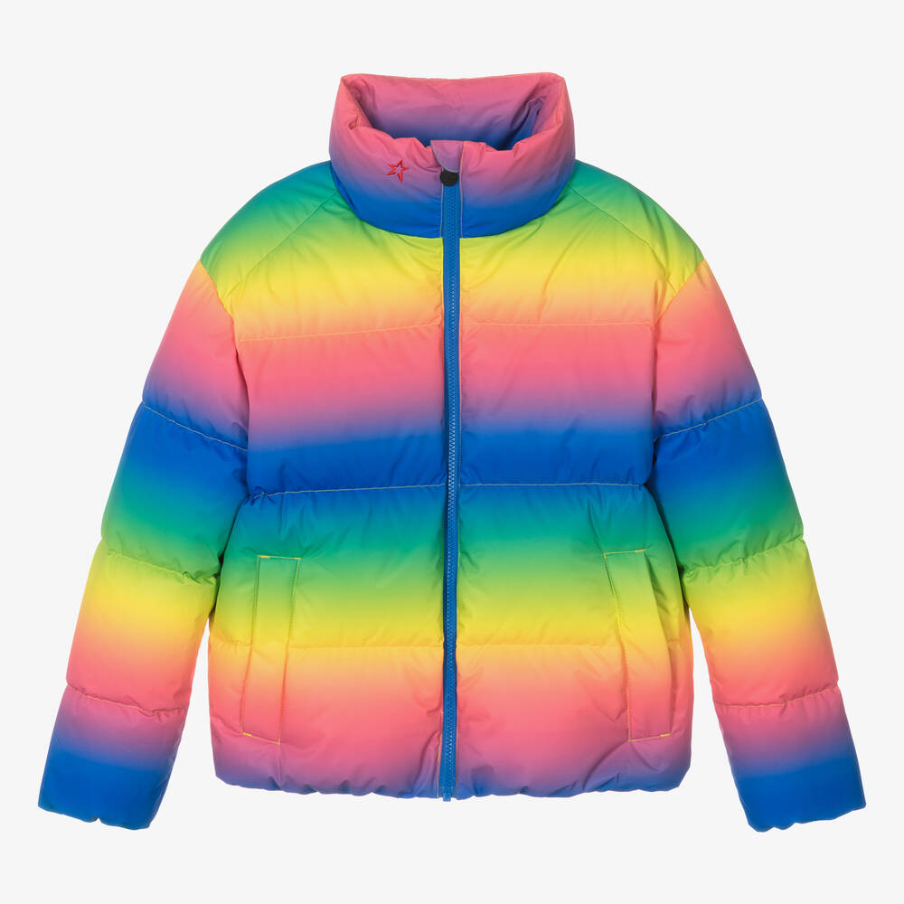Stand-out on the slopes in this colourful technical zip-up ski jacket for teen girls by Perfect Moment. Designed with a vibrant gradient rainbow pattern, it is embroidered with the iconic red star logo on the high neck and has slanted zipped pockets on the front. Down-filled and windproof for added warmth and comfort, it has a popper-fastened powder skirt to keep the snow out and an internal zipped pocket to keep ski essentials safe.