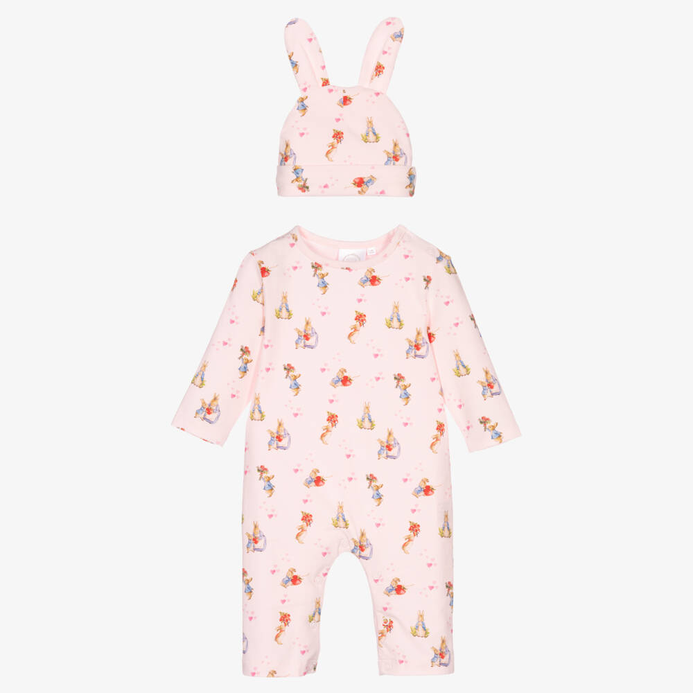 Pink cotton romper suit and hat set for girls from Peter Rabbit™ by Childrensalon. Made in super soft, stretchy jersey, both pieces have an adorable original Peter Rabbit illustration by Beatrix Potter, with hearts and flowers in pink and blue. The babysuit has easy-to-use poppers on one shoulder and between the legs for quick dressing. The coordinating hat has a turn-up brim and cute rabbit ear appliqués.